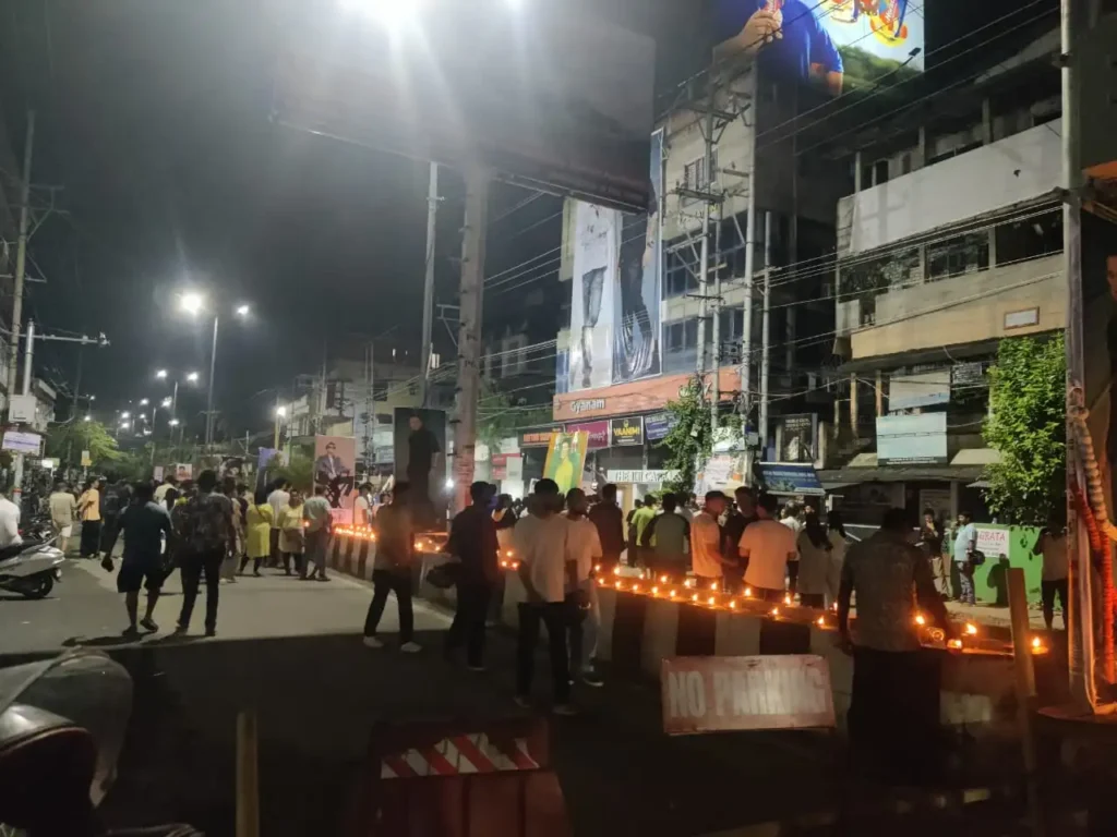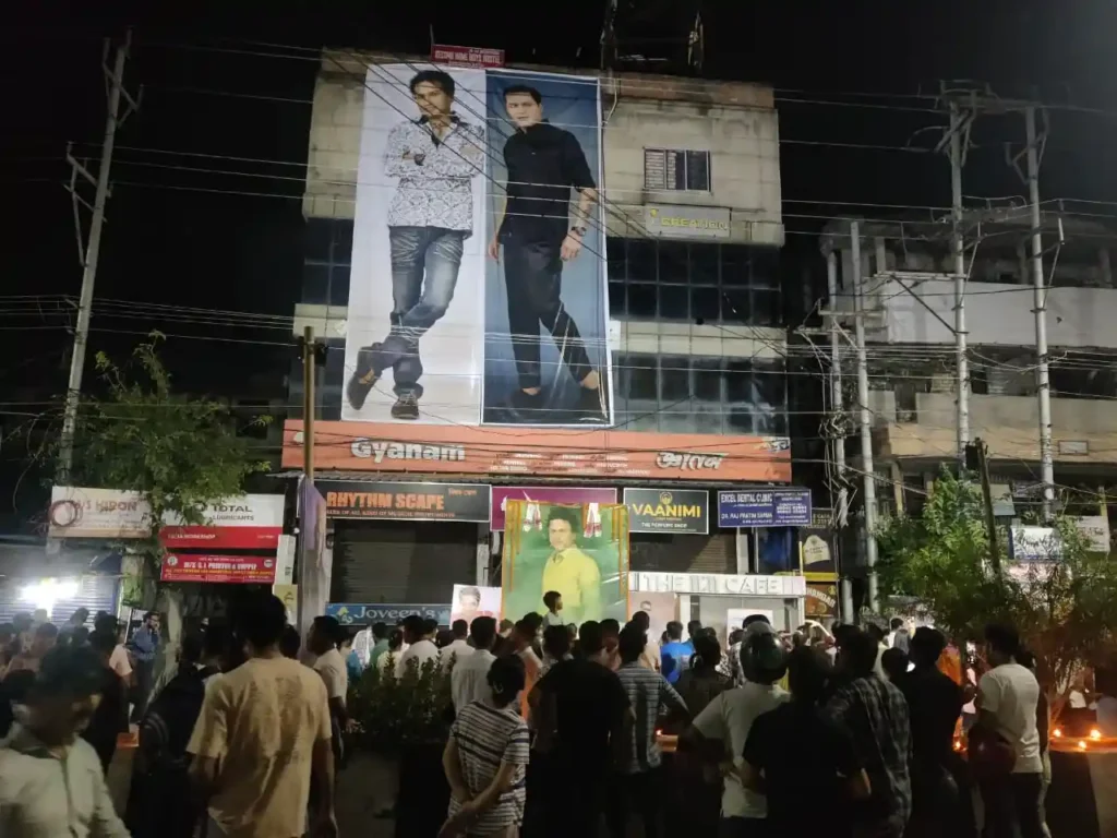 The Supermarket area, one of the busiest hubs of Guwahati, witnessed an extraordinary sight—thousands gathered, holding candles high, chanting “Joi Zubeen Daa” and singing his songs. Buildings were draped with massive banners of the icon, while murals and paintings began to appear across walls, immortalizing the legend in the cityscape.